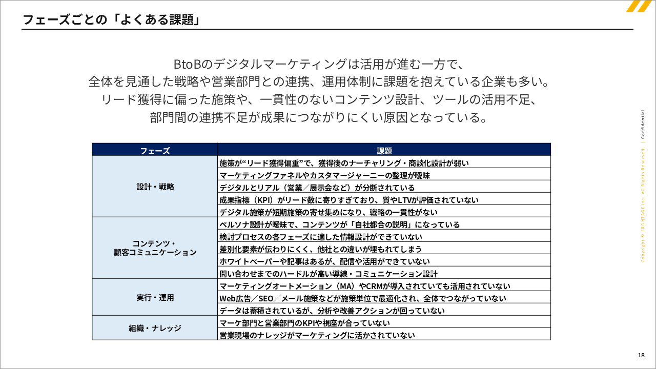 BtoBデジタルマーケティングにおいて、多くの企業がリード数を追うことに注力しています。しかし、リードの質や獲得後のアプローチ、顧客との関係構築に課題を抱えるケースは少なくありません。私たちは、短期的なリード数の追求ではなく、顧客理解やブランディングの視点を持った全体設計こそが、成果につながるマーケティングを実現すると考えています。BtoBマーケティングの本質的な課題を整理し、戦略の立案から実行までを一貫してご支援する私たちのアプローチを、事例を交えてご紹介します。ぜひご活用ください。