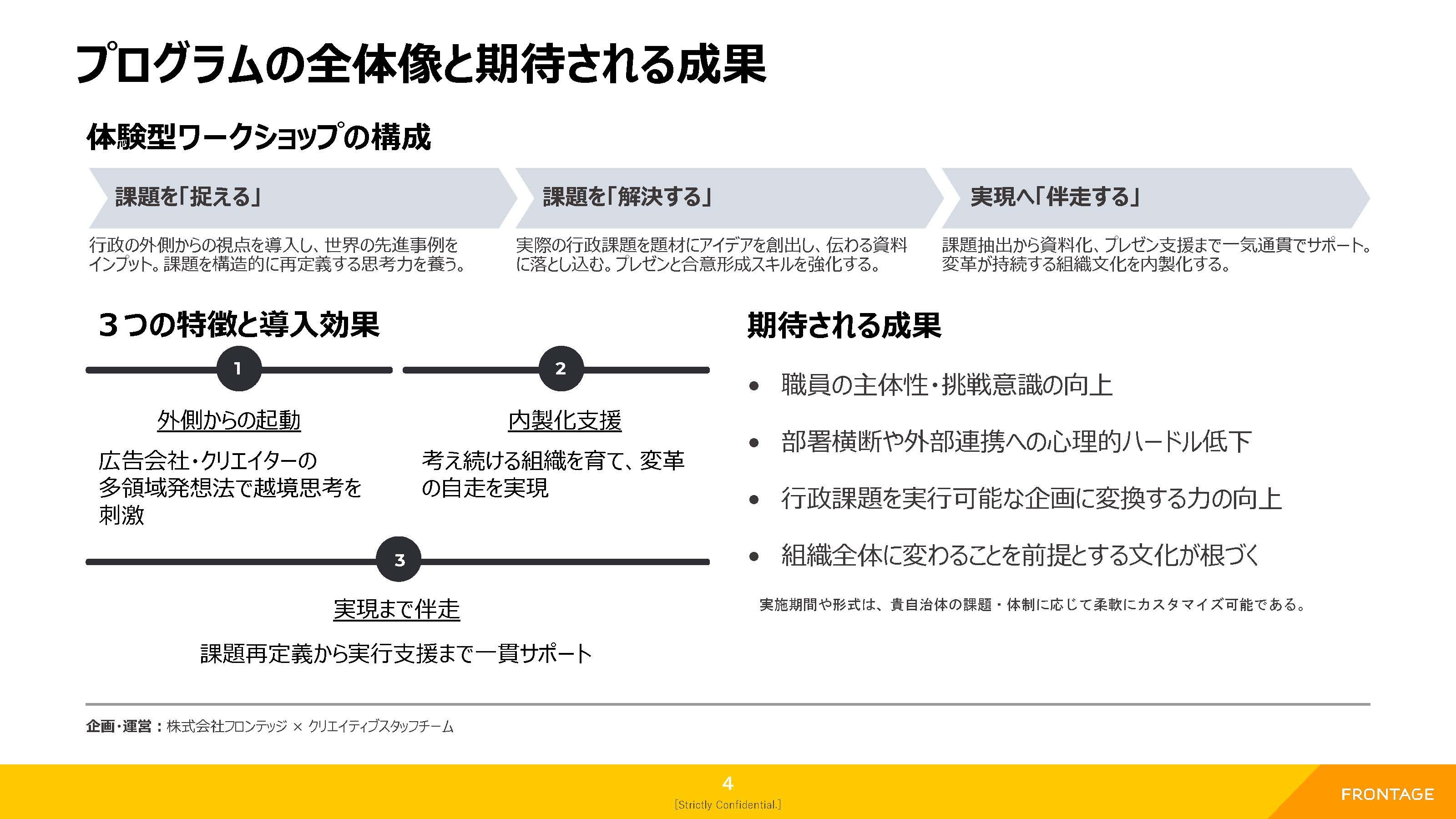 | 特徴 | 広告会社のクリエイティブノウハウ(合意形成設計力・複雑課題構造化力・伝わる資料化)を行政現場に注入 実践型ワークショップ:世界事例インプット→課題再定義→アイデア創出→プレゼン支援まで一気通貫で実施 |