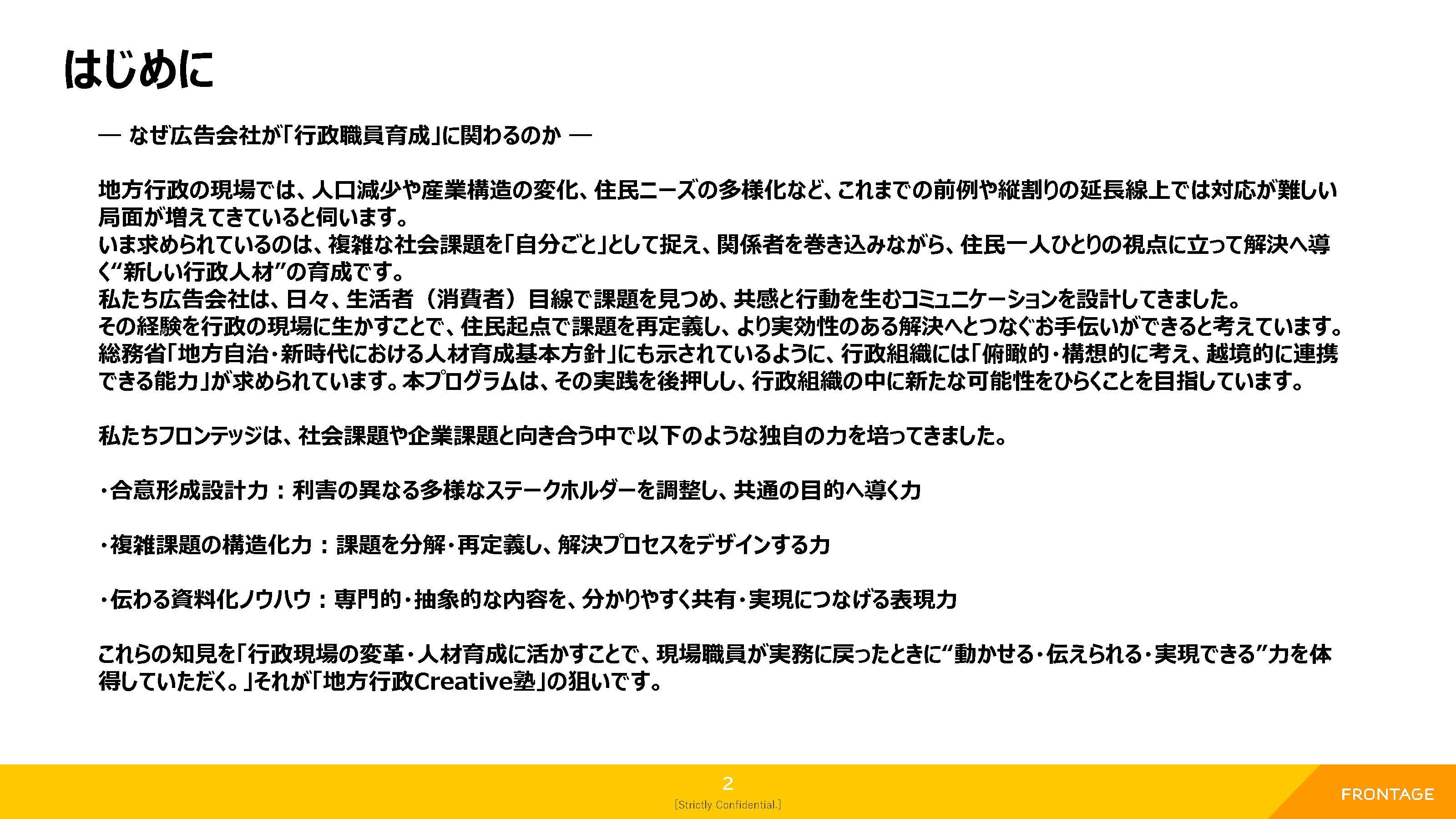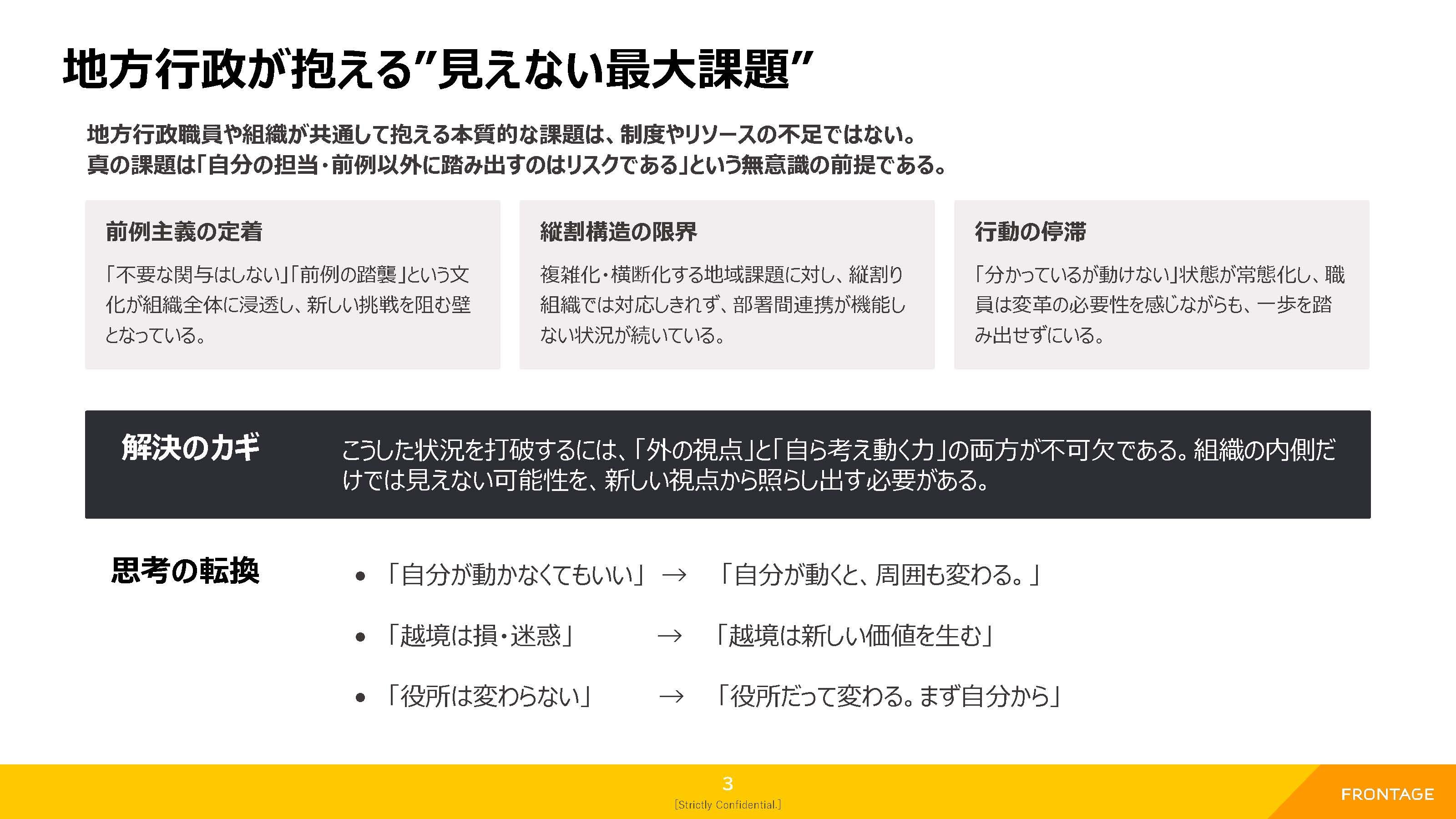 フロンテッジは、広告・ブランディングの現場で培った「生活者目線の課題構造化」「合意形成設計」「伝わる資料化ノウハウ」を行政に応用。