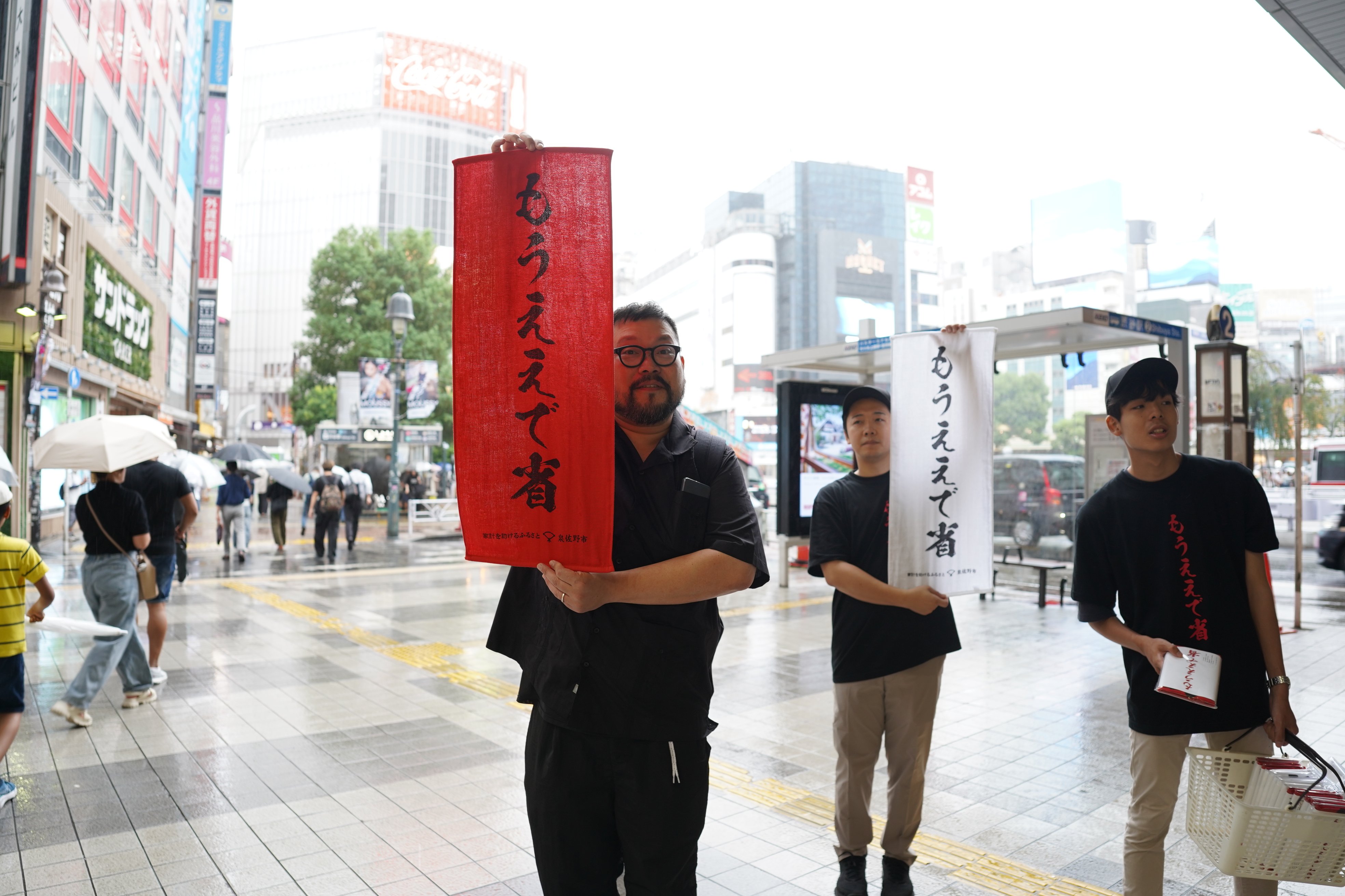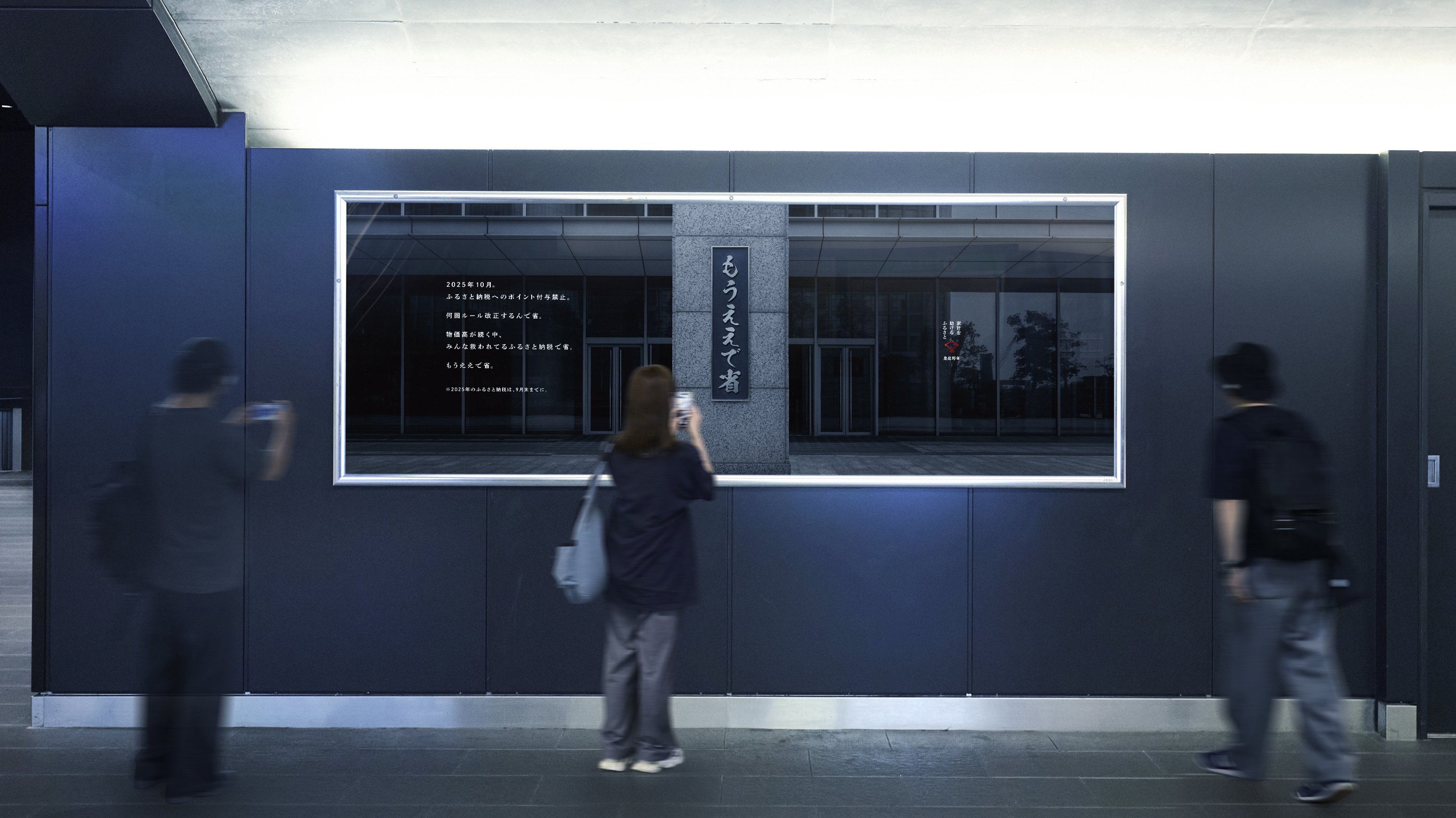 ふるさと納税のポイント付与は、すでに根付いている制度であり、物価高で苦しむ市民にとって生活の足しにできる制度です。大切な制度の改正を目前に控えた2025年9月、全国の地方自治体と市民を代表し、また繰り返された制度改正に対する意思として、そして今後繰り返されないことを願い、グラフィック広告とイベントをJR有楽町駅と東急渋谷駅で展開しました。コミュニケーションを行うにあたって大切にしたのは、ユーモアとシリアスさ。グラフィックではメインコピーのユーモアとビジュアル全体のシリアスさのバランスを意識。グラフィックを展開した2駅で1万枚配布したメッセージタオル(泉佐野市の特産品・泉州タオル)では、市民がその意思を掲げることができるようにシンプルなデザインに仕上げました。