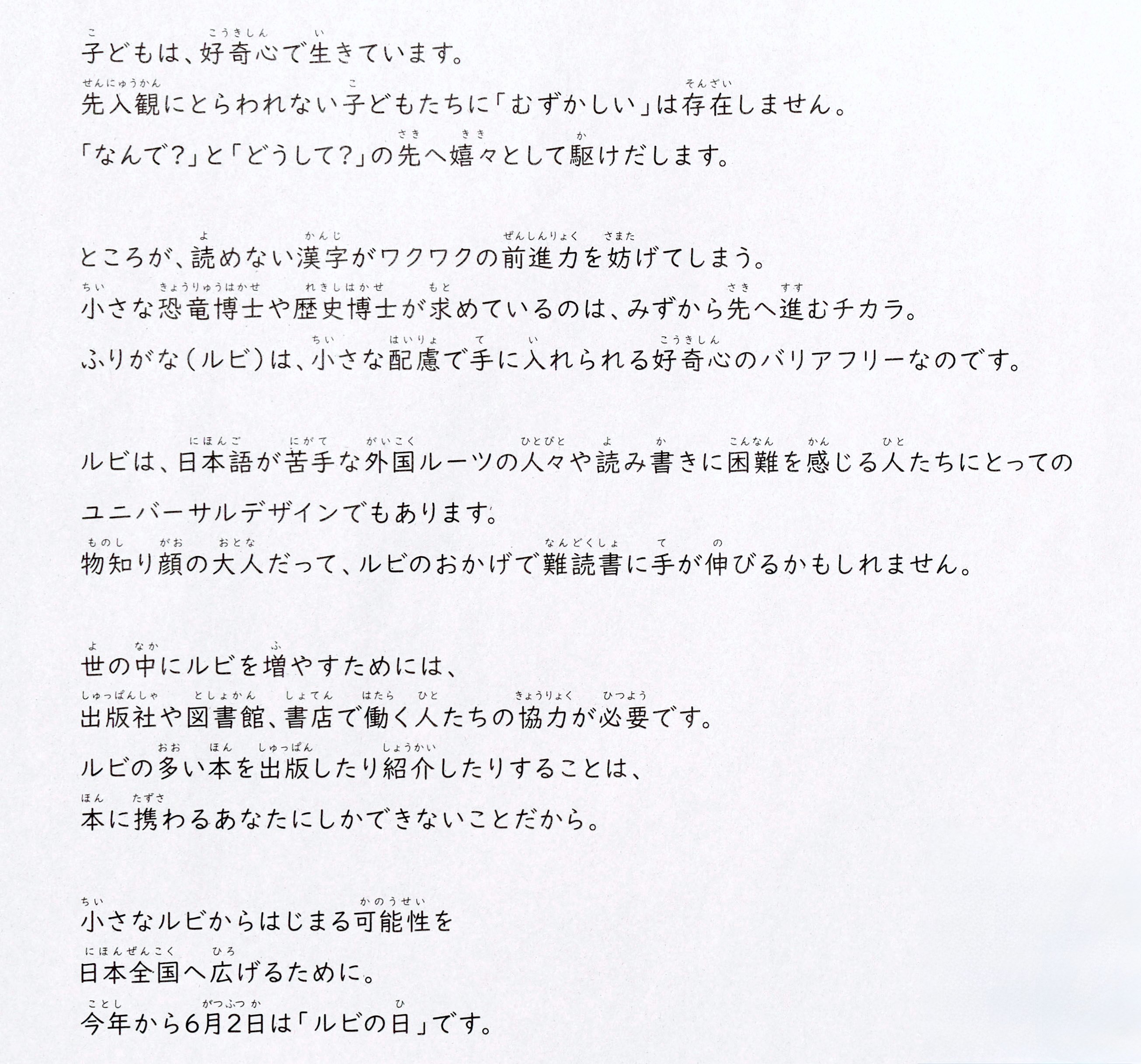 今年から新たに制定された記念日「ルビの日」に合わせ、漢字にルビを振ることの重要性やルビ財団の活動を伝える新聞広告を実施。