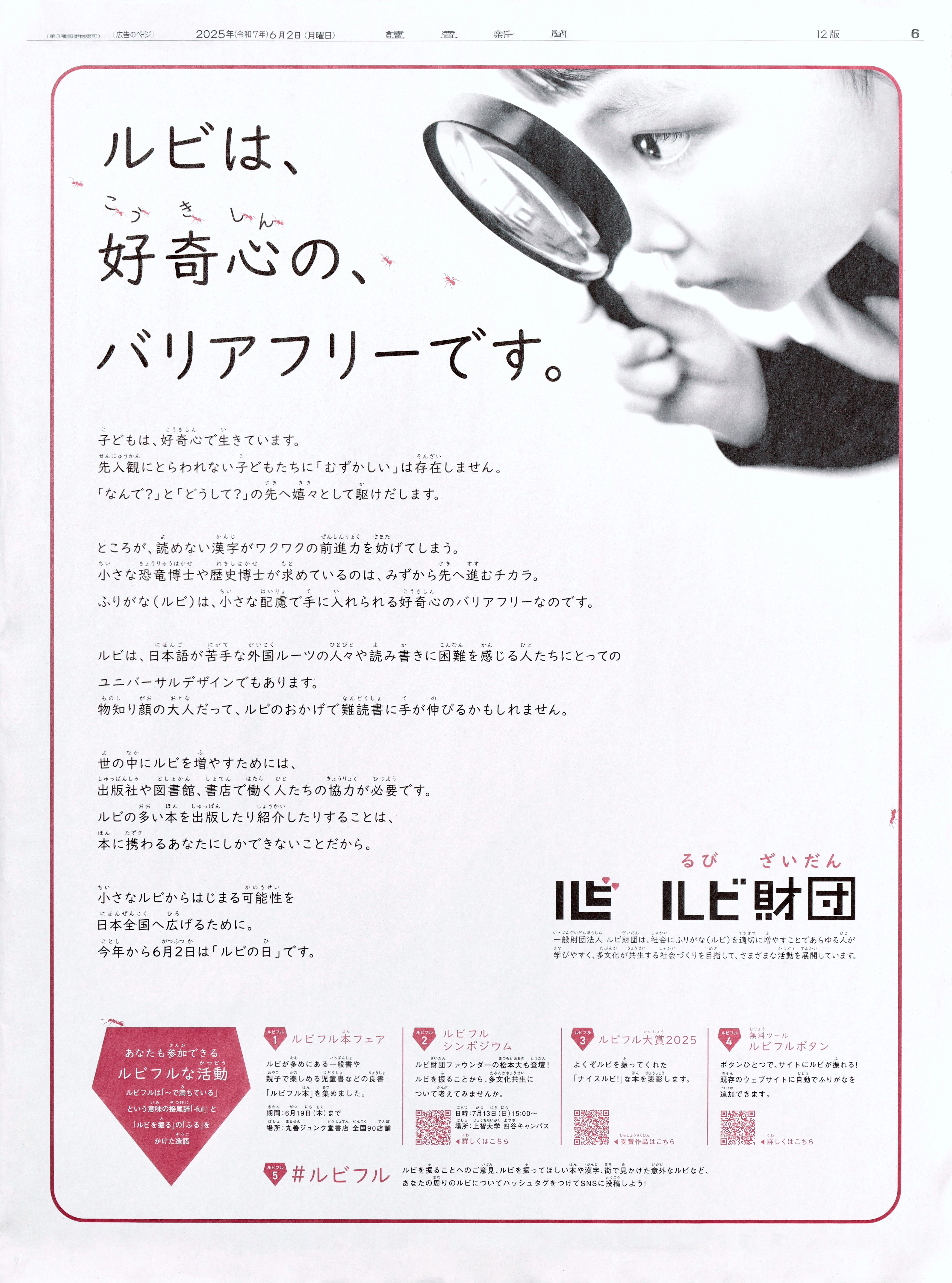 2025年より6月2日を「ルビの日」として制定し(一般社団法人日本記念日協会にて登録)、記念日当日に新聞広告を出稿。ルビ財団設立の想いや活動への共感を醸成し、様々なステークホルダーに対して行動を促す目的で実施されました。